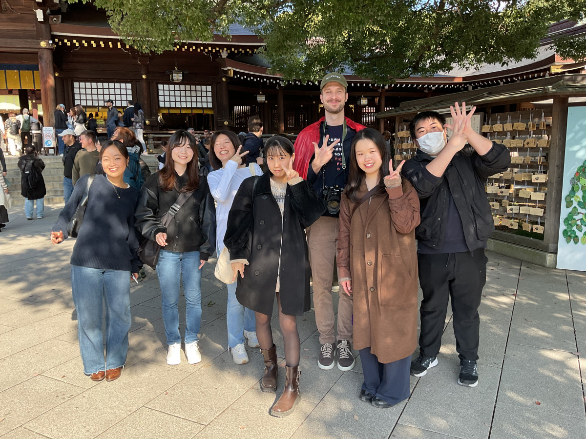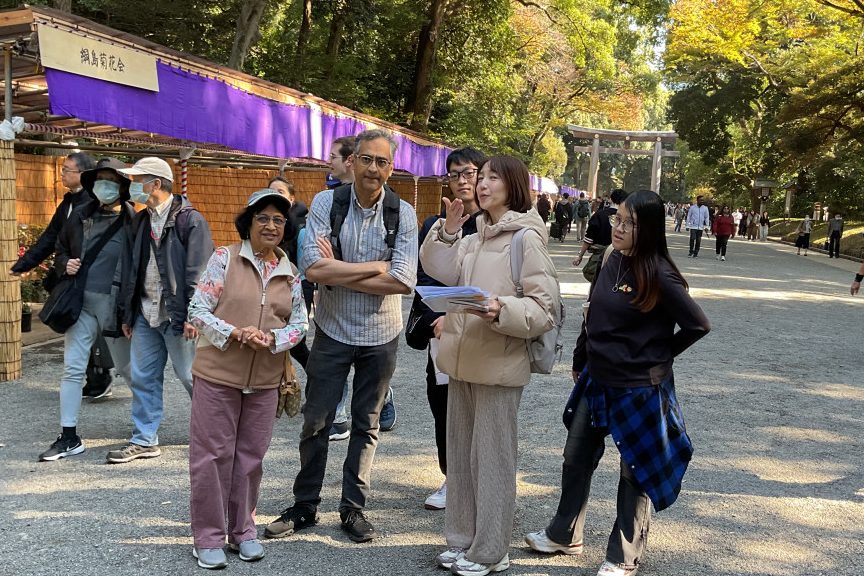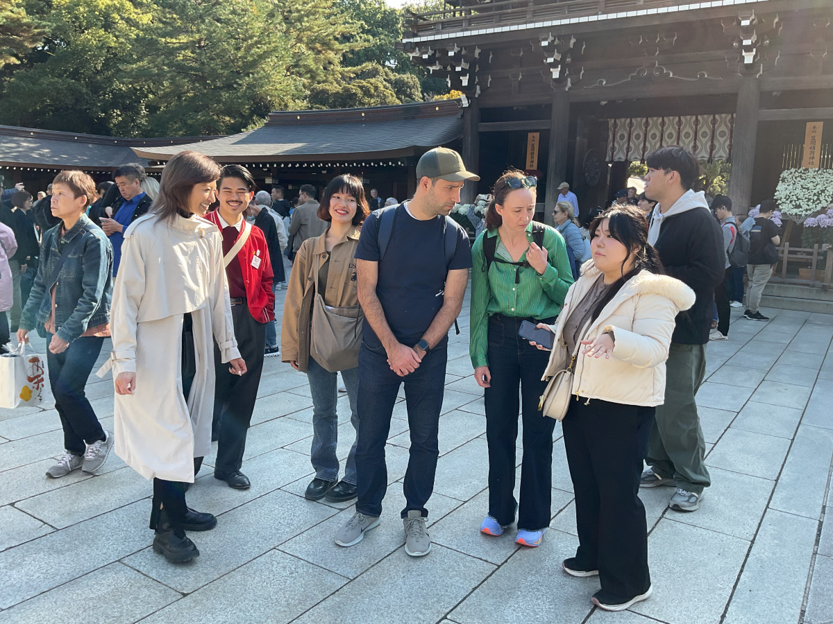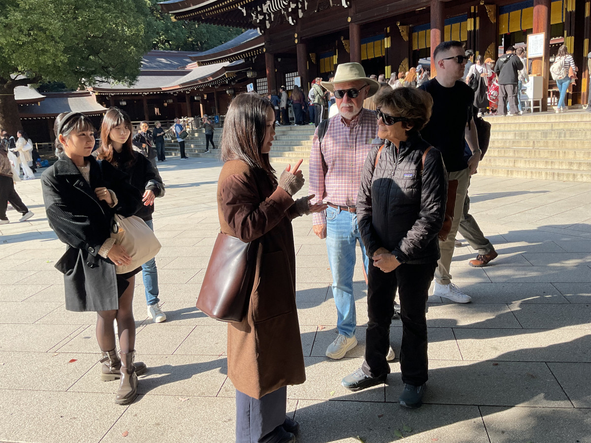 英語専攻科2年生(現・英語専攻コース)が、明治神宮にて通訳ガイド実習を実施しました。実習は、海外からの観光客で賑わう原宿駅近くの一の鳥居付近からスタートし、学生は積極的に観光客に声をかけながら、南参道を通って本殿まで通訳ガイドを行いました。当日は穏やかな晴天に恵まれ、七五三参りの日本人参拝客に加え、それを上回る多くの海外観光客が訪れていました。学生は、事前に授業で学んだ明治神宮の歴史や日本文化に関する知識を、英語を使ってわかりやすく伝えました。ご協力くださった海外観光客の方々からは、「すごくいい記念になった」「説明が上手だった」といった温かい言葉をいただき、学生は大きな自信と達成感を得ることができました。さまざまな国・地域の方々との交流を通して、学生は実践的な通訳ガイドスキルを磨き、教室で学んだ知識を実践の場で活用する貴重な機会となりました。