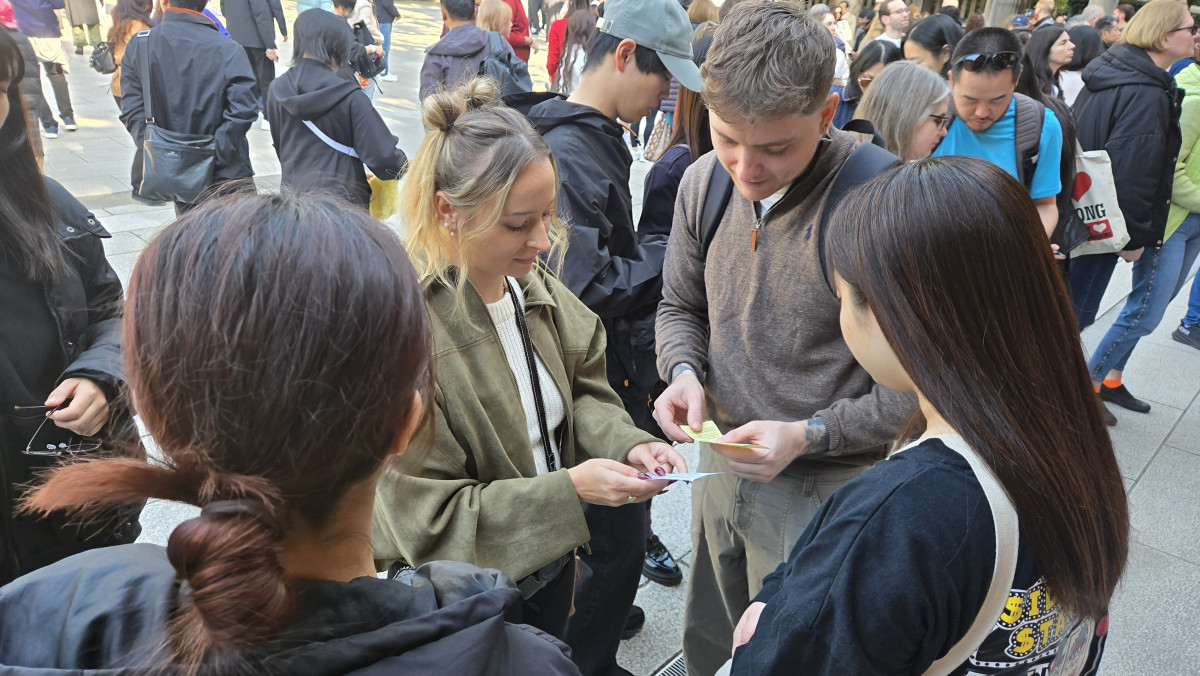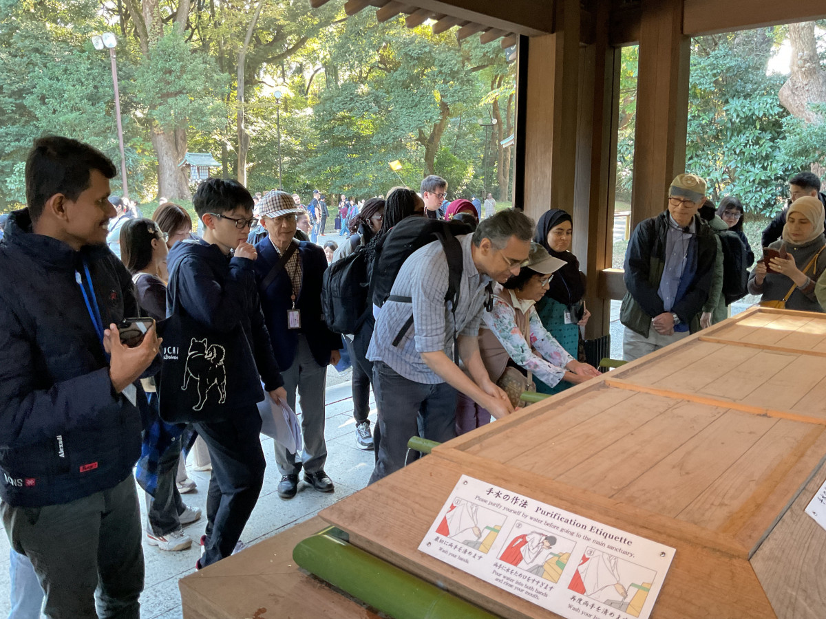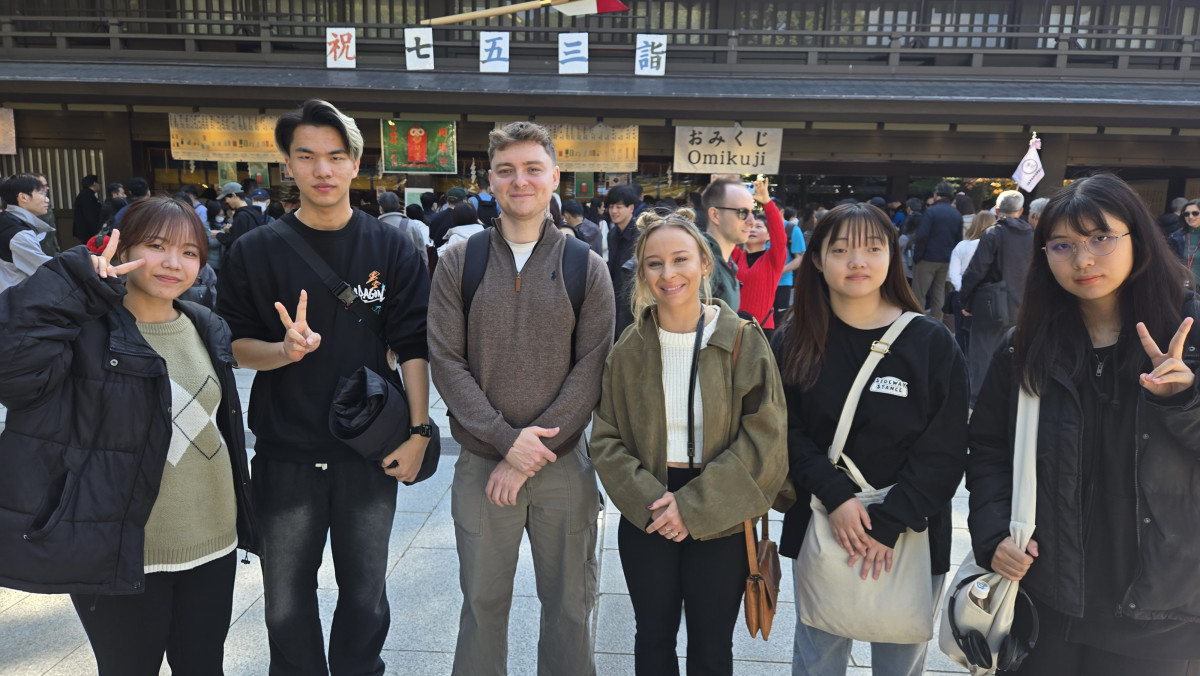 英語専攻科2年生(現・英語専攻コース)が、明治神宮にて通訳ガイド実習を実施しました。実習は、海外からの観光客で賑わう原宿駅近くの一の鳥居付近からスタートし、学生は積極的に観光客に声をかけながら、南参道を通って本殿まで通訳ガイドを行いました。当日は穏やかな晴天に恵まれ、七五三参りの日本人参拝客に加え、それを上回る多くの海外観光客が訪れていました。学生は、事前に授業で学んだ明治神宮の歴史や日本文化に関する知識を、英語を使ってわかりやすく伝えました。ご協力くださった海外観光客の方々からは、「すごくいい記念になった」「説明が上手だった」といった温かい言葉をいただき、学生は大きな自信と達成感を得ることができました。さまざまな国・地域の方々との交流を通して、学生は実践的な通訳ガイドスキルを磨き、教室で学んだ知識を実践の場で活用する貴重な機会となりました。