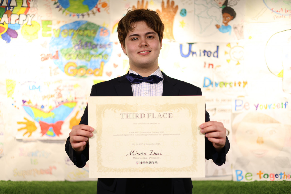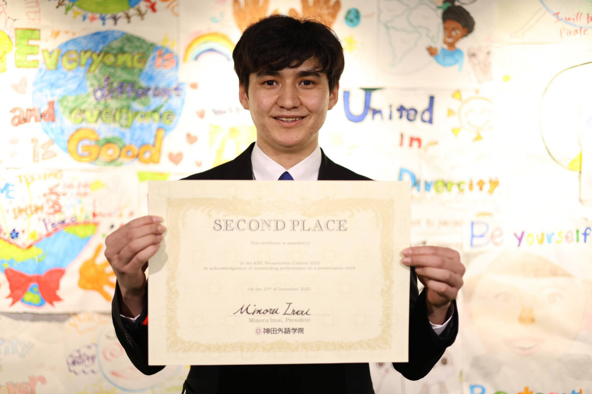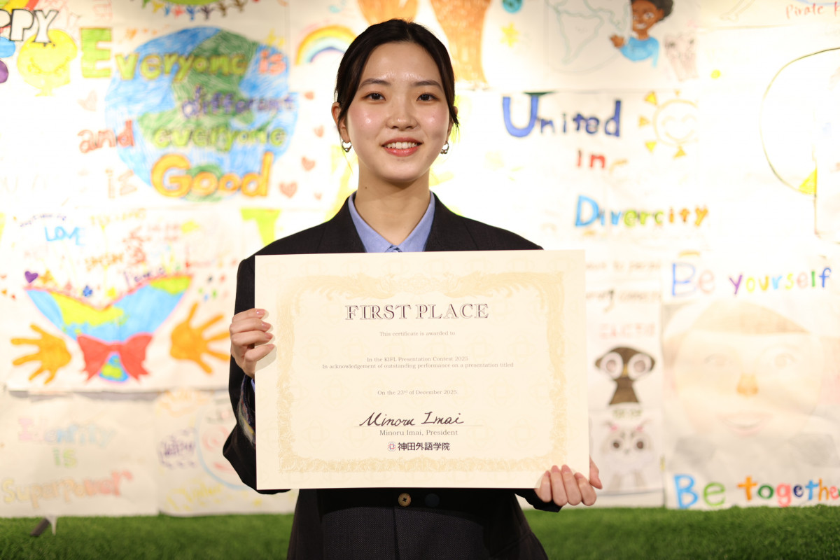 2025年12月23日、今年で開催14年目になる全学英語プレゼンテーションコンテストを実施しました。このコンテストでは「外国人教員によるメンター制度」が設けられています。メンターは発表のテーマ決めからスクリプトの作成、立ち居振る舞いまで、学生のプレゼンテーションを徹底的に指導します。学生は以下の3つからテーマを選択し、神田外語学院での日頃の学びの成果を発揮しました。