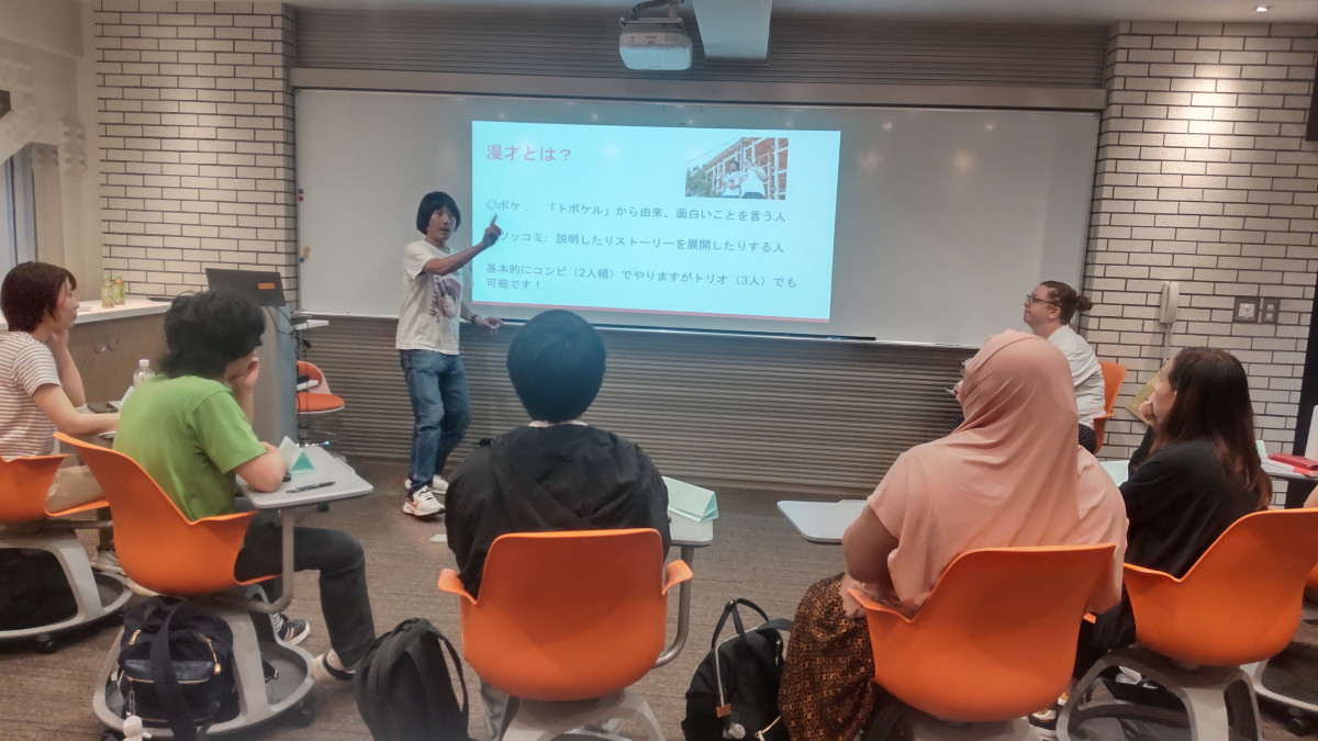 キャリア日本語科レベルⅢクラスにて、吉本興業所属芸人「フランポネ」を招いた特別ワークショップ「留学生のための漫才体験」を開催しました。参加した留学生たちは、日本の笑いの文化を学ぶとともに、実際に漫才のネタ作りやツッコミのタイミングなどを体験しました。参加者は「日本語で笑いを表現するのは難しかったけれど、とても楽しかった」と語り、日本文化への理解を深める機会となりました。
