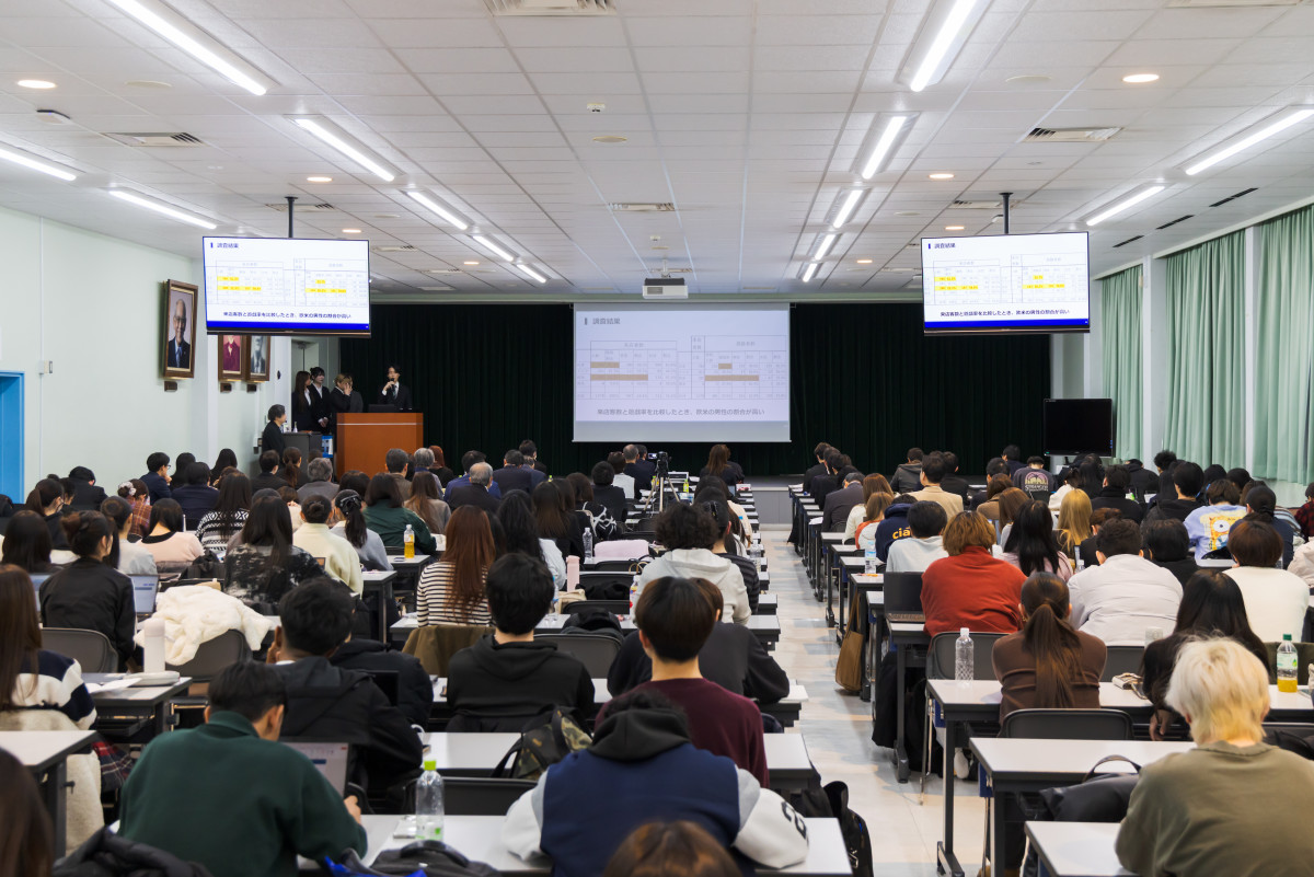 2026年1月7日(水)、国際ビジネスキャリア科※による「ビジネス研究発表会」が実施されました。同学科では、企業から与えられた課題に対して提案を行う「Project Based Learning(課題解決型授業)」や、チームごとにテーマを設定して調査・研究を行う「ビジネス研究演習(ゼミ)」に取り組んでいます。今回の発表会では、学生たちが情熱を注いできた学びの成果を、プレゼンテーション形式で発表しました。当日は、学生の活動に助言を行ってきた企業担当者や、高専連携教育を実施している高校の先生方をお招きし、講評をいただく場面も見られました。今回は2年生だけでなく1年生もプレゼンテーションに参加し、先輩学生による発表から多くの学びを得る機会となったようです。これまで国際ビジネスキャリア科を中心に実施してきた同発表会は、次年度以降はビジネスコミュニケーション科全体の取り組みとして、さらに発展させていく予定です。企業や地域と連携し、チームでビジネスデザインに取り組んできた経験は、学生にとって将来につながる大きな力となるはずです。