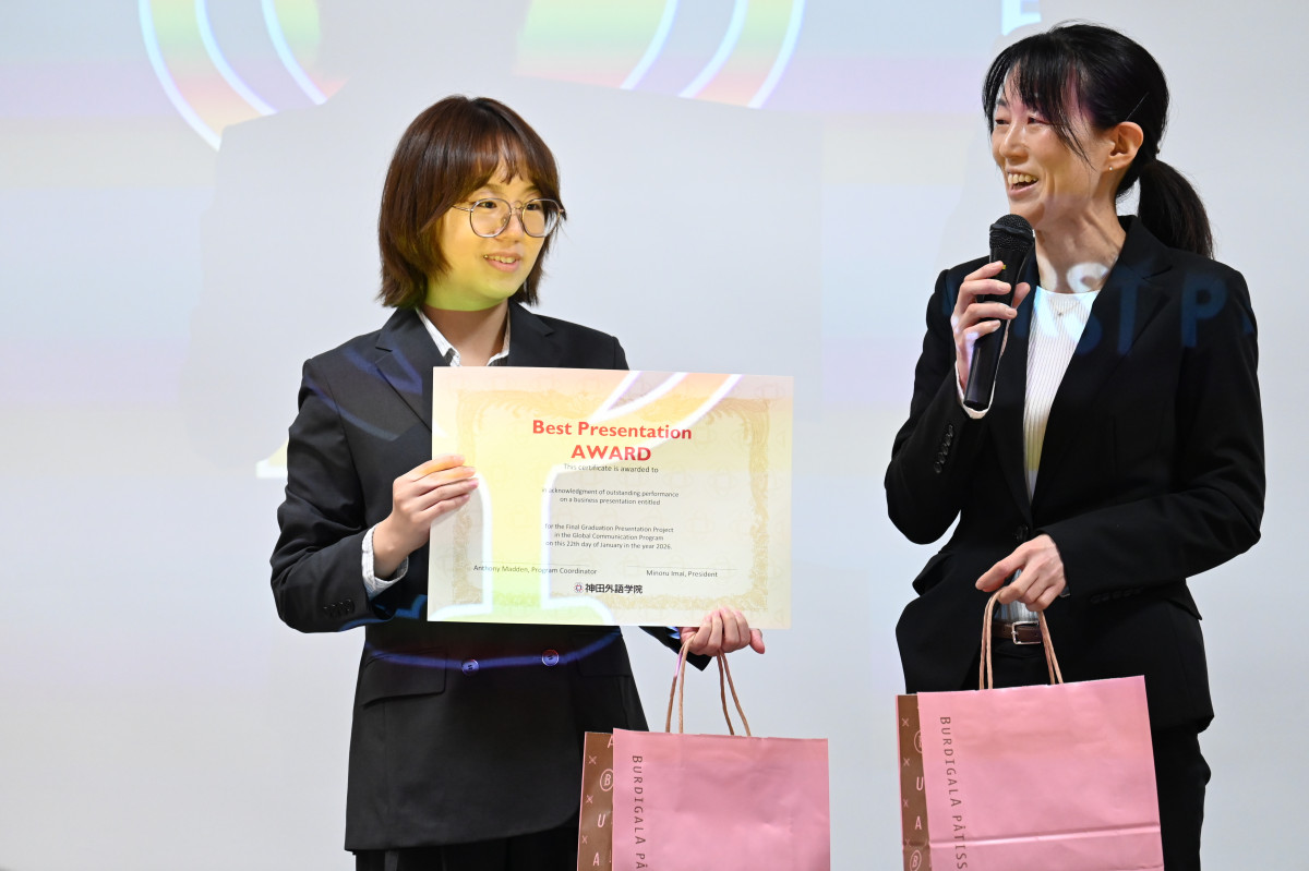 2026年1月22日(木)、グローバルコミュニケーション科※2年生による「卒業制作発表」が実施されました。この学科では、国際舞台で活躍できるハイレベルな英語力を身につけるとともに、起業に必要なビジネススキルをEnglish Onlyで学びます。卒業制作では、学生が2年間で育んだ問題解決力やリサーチ力を活かし、チームでオリジナルのビジネスプランを英語でプレゼンテーションしました。2年間の学びの集大成として、学生一人ひとりの成長を感じられる発表会となりました。