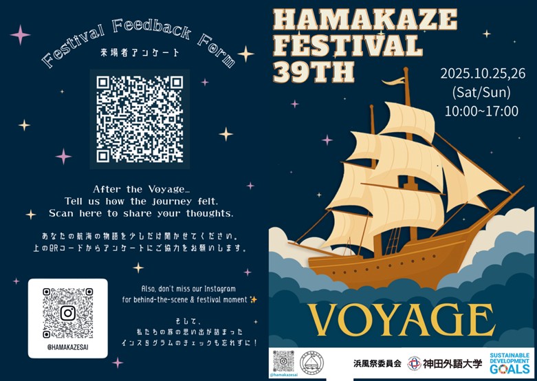 今年のテーマは「Voyage」。「旅」や「航海」を意味するこの言葉には、浜風祭という名の旅が来場者にとって特別な思い出となり、関わるすべての方が“乗組員”として新たな航海に出発するような体験となることを願う気持ちが込められています。本学は、世界の言語と文化を理解し、柔軟な心でコミュニケーションできる人材の育成をミッションとして掲げています。学園祭においても、その理念を体現し、地域社会とともに多文化共生を推進しています。