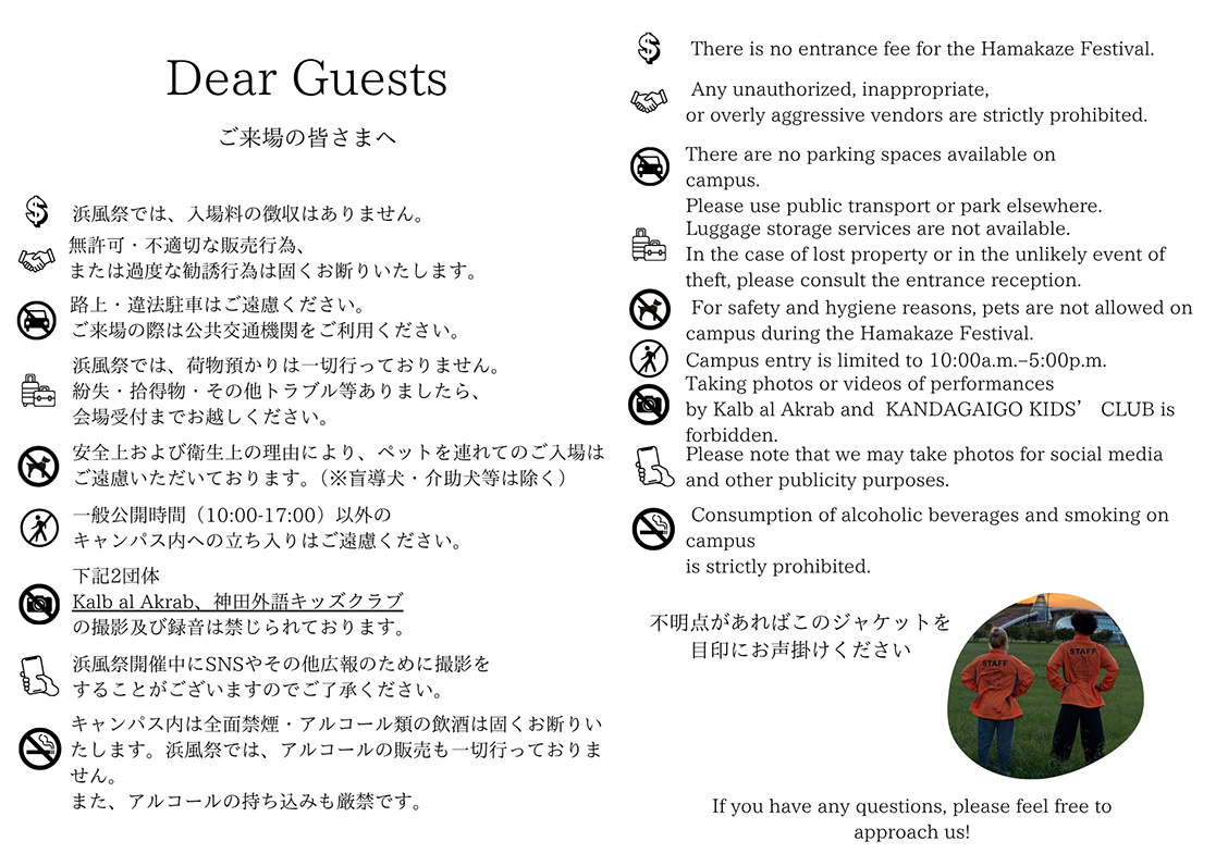 本学のさまざまな特色ある施設を活用し、外語大ならではの演出を行い、来場者の皆さんには、見る、聞く、食べる、体験するという形で、新しい発見をしていただける神田外語大学の学園祭「浜風祭」です。