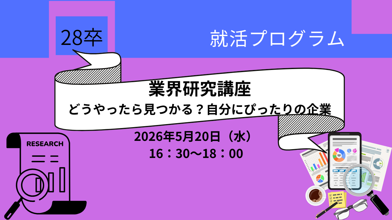 4:30 PM - 6:00 PM 【28卒】 業界研究 どうやったら見つかる?自分に合う企業を探そう 5月20日 - 4:30 PM - 6:00 PM 【28卒】 業界研究 どうやったら見つかる?自分に合う企業を探そう