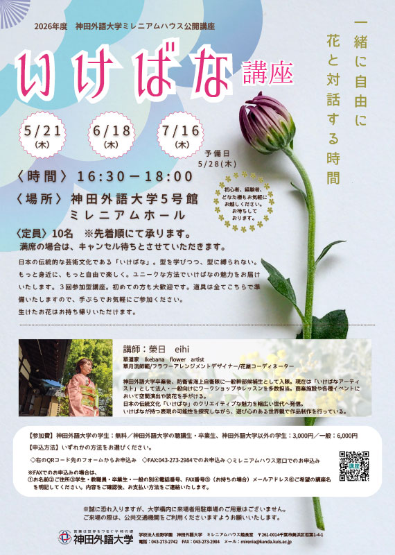 外国の文化を学ぶ上で必要となる「日本文化」のさまざまな体験を提供する本学5号館ミレニアムハウスが、在学生をはじめ、近隣の方々にもご参加いただける公開講座をご紹介します。