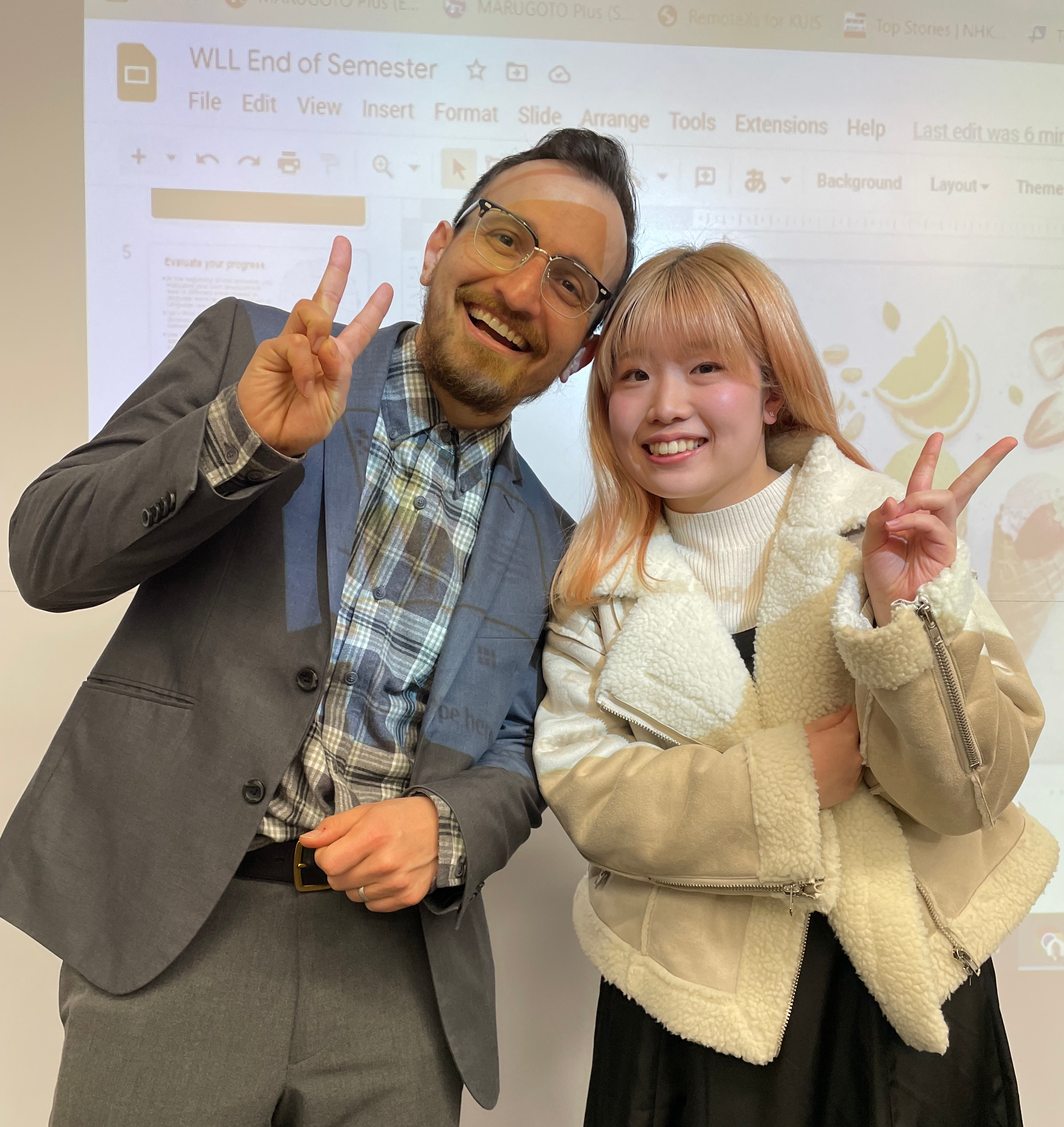 神田外語大学は、英語で行われる授業も多く、留学生をまじえた少人数の参加型授業やグループワーク、プレゼンテーションを通じて、誰でも英語力を伸ばせる環境が整っています。入学したばかりの頃は先生が話す英語を全く理解できなかった学生も、夏休み前には英語で2、3分のプレゼンテーションができるようになり、クラス全体の英語力が短期間でレベルアップしていることに驚きました。私自身、大学入学後にTOEICが100点以上アップしており、留学に匹敵する成果を感じています。