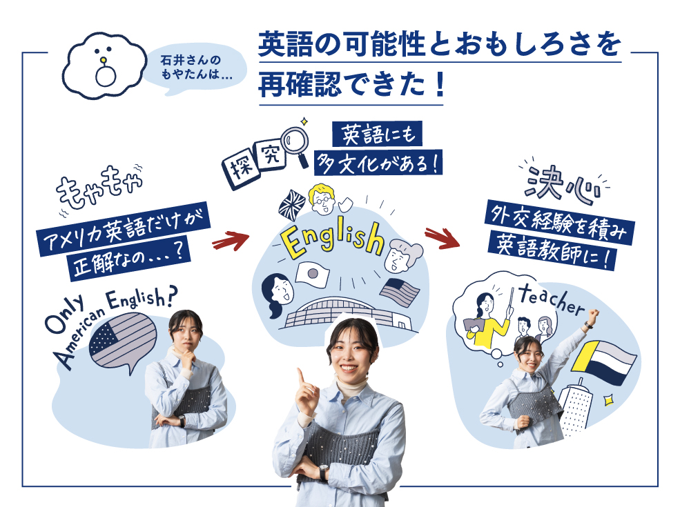 卒業後は、ドバイの日本国総領事館で在外公館派遣員として働く予定です。第一志望であったため、内定の連絡を受けた時は飛び上がるほど嬉しかったです。英語の先生になりたいという気持ちは今も変わりませんが、私の目標は生徒の「英語を学びたい」という気持ちを引き出せる教師になることです。そのために、まずは自分自身が海外経験や外交の場を経験し、そこで得た学びや感動など、教科書には載っていないような話ができるよう、話題の引き出しを増やしていきたいと考えています。進路について相談した先生からも「教師の仕事は楽しすぎて、一度始めたら辞められなくなる。だから教師になる前にやりたいことは全部やり切っておくといい」とアドバイスをいただきました。この言葉を胸に、将来生徒たちと向き合う日を心待ちにしながら、さまざまなことにチャレンジしていきたいと思います。