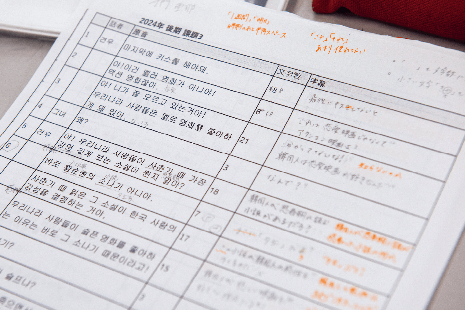 実践的な学びを通じ、語学力はもちろん、韓国の文化への理解や日本語の語彙力を深め、クリエイティブなスキルを身につけていく「韓国語映像翻訳法」。言葉選びに悩みながらも意欲的に取り組む学生たちの姿は、映像翻訳の最前線を学ぶ楽しさを語っていた。
