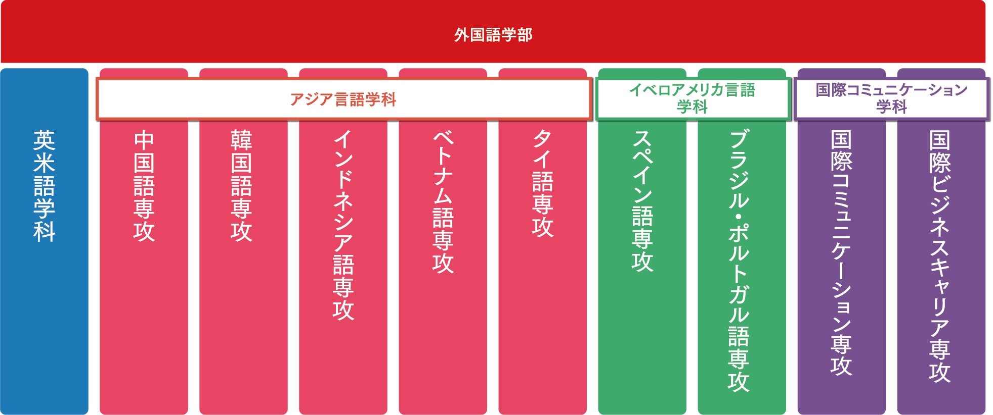 外国語学部は4学科に9専攻があり、「語学」を習得しながら、留学、海外研修など、未来に繋がる学びが可能です。