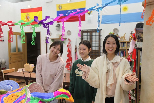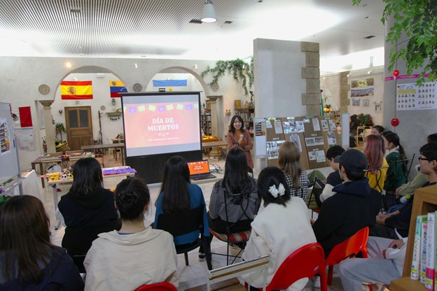 MULCのスペイン語エリアで行われた講義では、現地の言葉だけでなく、メキシコの伝統的な切り絵細工「パペル・ピカド」を飾り、祭壇に色鮮やかな花や故人の写真を供えるなど、文化の奥深さを体験しました。