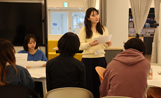 発表の中では、学生がオーディエンスに対して「相談したい点」を提示し、グループディスカッションを実施しました。参加者は自由に好きな場所へ移動しながら発表を聞くことができ、ゼミや学部の枠を越えた活発な意見交換が行われました。学生たちは終始レジュメを手に真剣に話を聞き、議論に積極的に参加している様子が印象的でした。