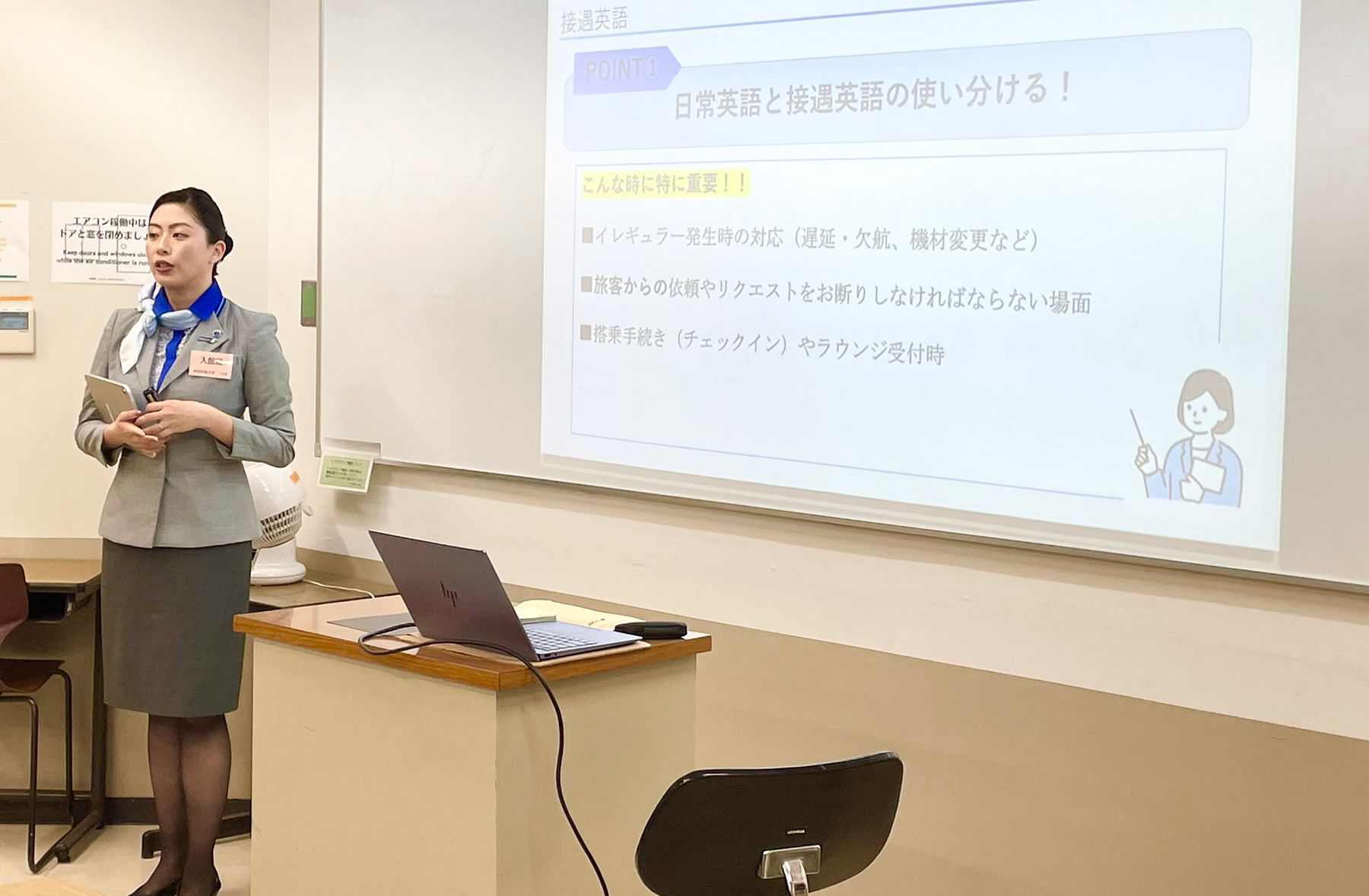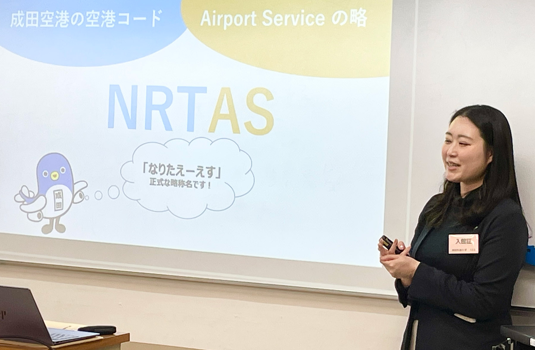 2025年12月18日(木)4限目「ホスピタリティ英語」の授業の一環として、小原隆子特任准教授のアレンジのもと、ANA成田エアポートサービス(以下NRTAS)人事部の小枝希氏とグランドスタッフの籾山麗奈氏をお招きし、NRTASと空港でのホスピタリティについてお話しいただきました。お二方は神田外語大学英米学科の卒業生であることから、学生たちの将来のキャリアのロールモデルとしてご登壇いただきました。