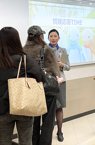 授業では、前半にNRTASの概要、成田国際空港の未来像、グランドスタッフの業務内容に加えて、実際に外国人のお客様との対応で使用している接遇英語のワークと実演も交えていただきました。後半では学生との質疑応答を行っていただき、仕事のやりがい、業務でこころがけていることについて質問がありました。また、お二方が神田外語大学在学中に心がけていたこと、英語の勉強方法、授業以外の活動など、学生たちが今から実践できるようなアドバイスもありました。授業終了後も教室に残ってお二方に質問をする熱心な学生の姿が見られました。将来、航空会社を目指す学生たちにとって充実した時間になり、夢を実現するための行動につながったようです。