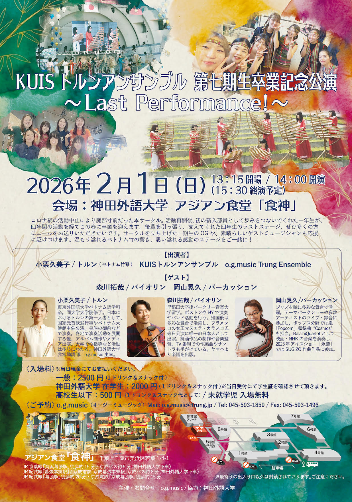 コロナ禍により活動が止まり、一時は存続の危機にあったKUISトルンアンサンブル。活動再開後、最初の新入部員として歩みをつないだ学生たちが、この春、四年間の活動を経て卒業を迎えます。後輩を支え、引っ張り続けてきた彼らの集大成となるラストパフォーマンス。創部期のOGや、第一線で活躍するゲストミュージシャンも駆けつけ、この日限りの、特別なステージをお届けします。