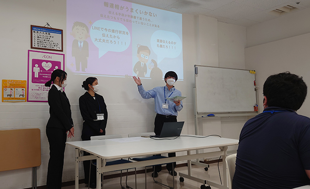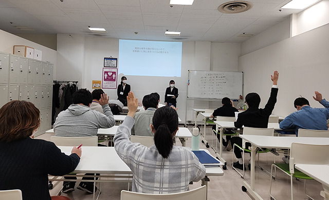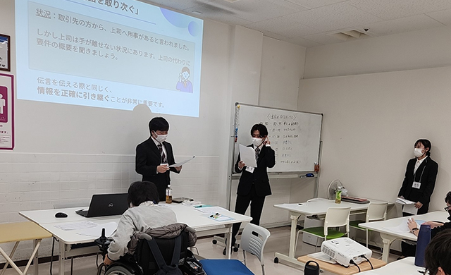 〇✕クイズやロールプレイを用い、電話応対や伝言といった実務スキルの習得を目指しました。