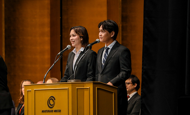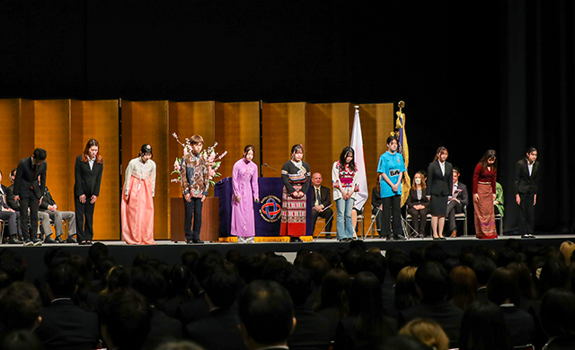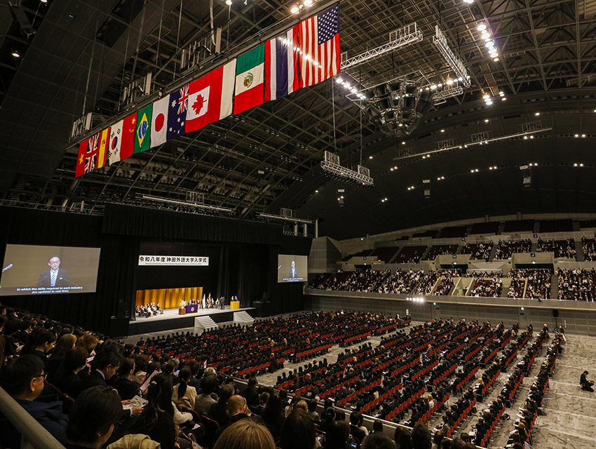 2026年4月1日(水)、幕張メッセの「幕張イベントホール」にて、新たな学部生(含:2・3年次編入生)・大学院生合計1,118人を迎えました。式典では、在学生勝田あいこさん(中国語専攻新3年生)と木村友さん(グローバル・リベラルアーツ学科新3年生)の司会により、日本語と各専攻語である中国語、英語により執り行われました。