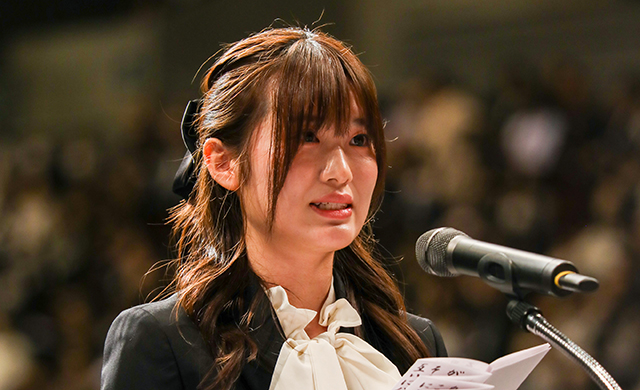 新入生代表による宣誓では、嶋浦屋凛さん(韓国語専攻)が登壇し、これから始まる大学生活の決意を力強く述べました。