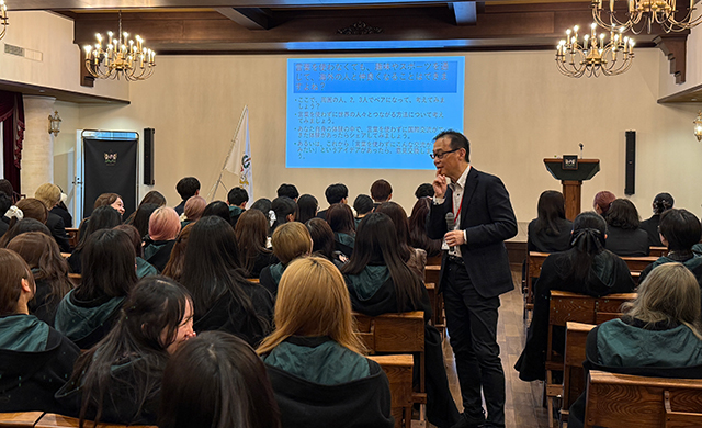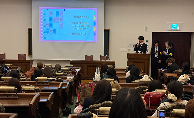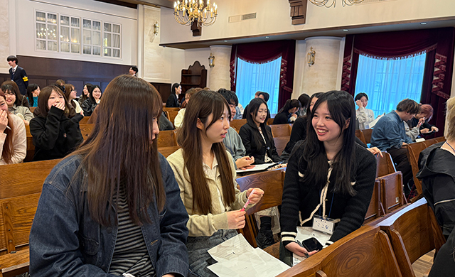 後半のグループワークでは、言葉を使わずに世界とつながる手法をディスカッションし、表現や活動を通じたコミュニケーションの可能性を探りました。学長は自身の経験をもとに、外国語だけでなく自分の強みを通じたつながりの可能性を伝え、新入生は自らの可能性と向き合い、新しい一歩を踏み出すきっかけとなるセッションになりました。