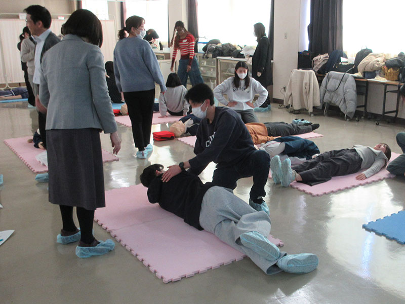 実習では、胸骨圧迫やAEDを用いた緊迫感のあるトレーニングが行われ、学生たちは真剣な面持ちで技能の習得に励んでいました。事後アンケートでは、回答者の94.4%が「満足」と回答しており、非常に充実した内容であったことが裏付けられています。