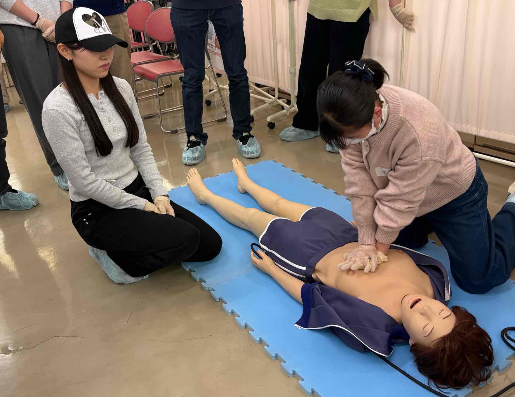 ・これまで胸骨圧迫やAEDの知識はありましたが、実際にどのような感覚で行うのかわからず、正直怖さもありました。しかし講習で処置の必要性や、行わなかった場合の危険性を学び、早く対応することの大切さを理解できました。保健医療大学の先生方が専門知識に基づき丁寧に教えてくださったおかげで、「これなら自分でも行動できるかもしれない」と思えるようになりました。(本学学生)